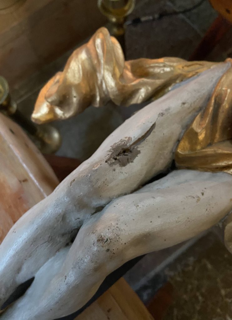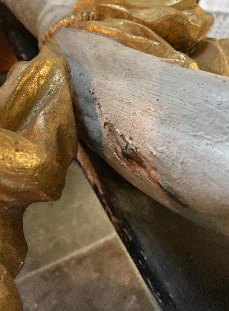 Zabytki w naszej świątyni krok po kroku odzyskują swój blask. Jednym z pierwszych etapów prac przy zabytkach ruchomych w naszej świątyni jest dezynfekcja i dezynsekcja oraz zabezpieczenie warstwy malarskiej. W bieżącym roku takim zabiegom poddaliśmy KRUCYFIKS TĘCZOWY z XVIII w.
